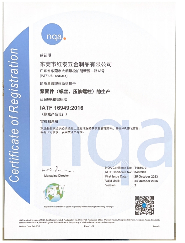 東莞市紅泰五金制品有限公司,公司占地六千多平方米,擁有五十多組螺絲機(jī)及六十臺(tái)自動(dòng)車(chē)床設(shè)備。是一家專(zhuān)業(yè)設(shè)計(jì)、生產(chǎn)ISO、DIN、GB、JIS、ANSI、BS及客戶(hù)指定特殊要求的高精密五金緊固件的制造企業(yè)。